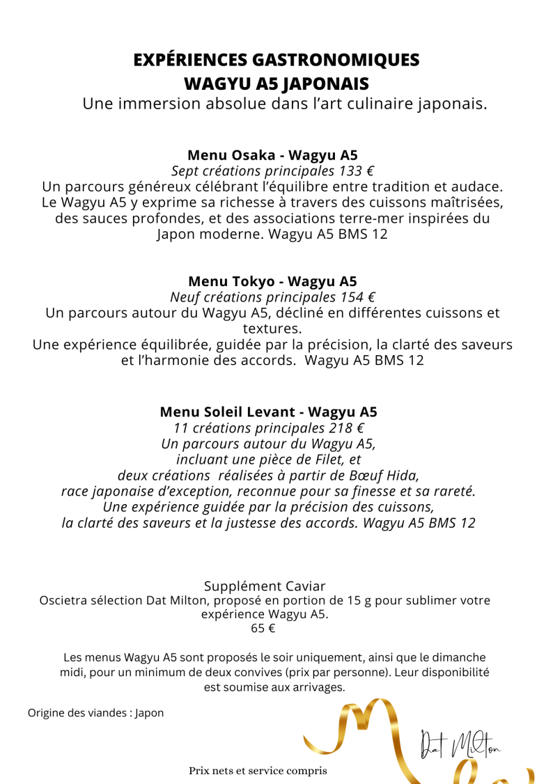 Les menus Wagyu A5 sont disponibles sur réservation uniquement, pour un minimum de deux convives.