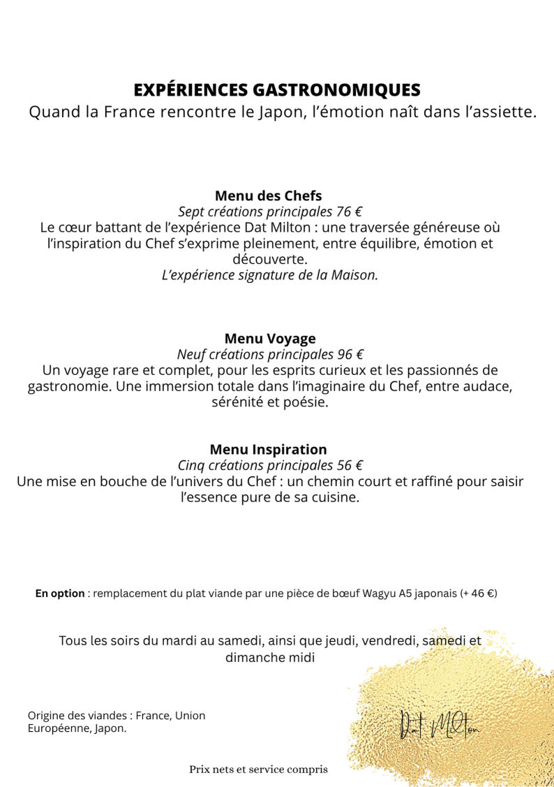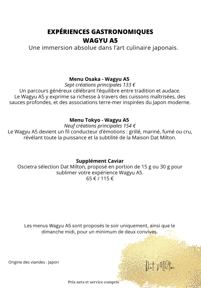 Les menus Wagyu A5 sont disponibles sur réservation uniquement, pour un minimum de deux convives.