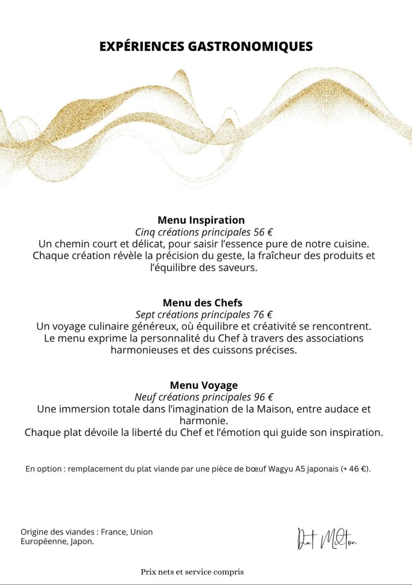 Le Chef vous propose trois menus gastronomiques, entièrement faits maison, mêlant précision, émotion et créativité.