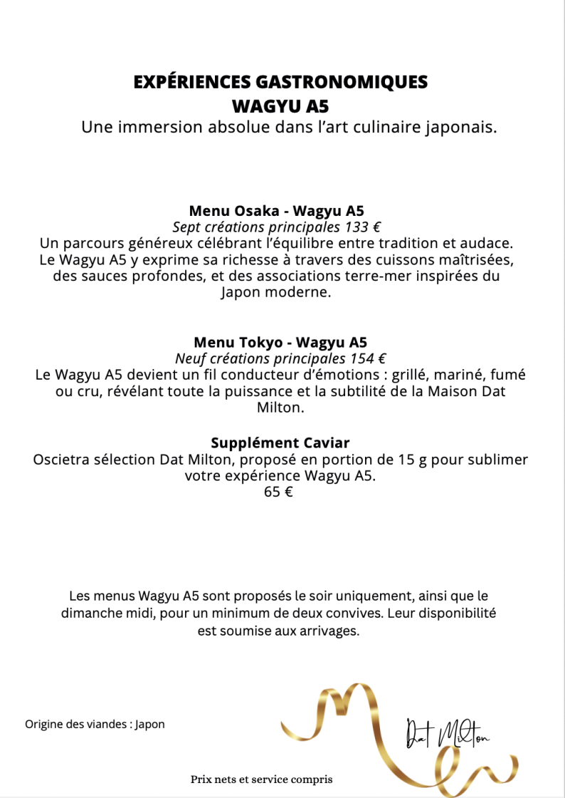 Les menus Wagyu A5 sont disponibles sur réservation uniquement, pour un minimum de deux convives.