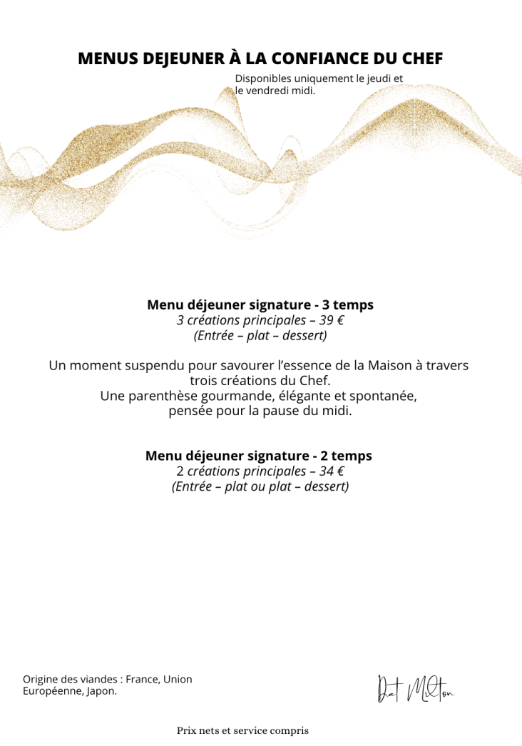 Chaque menu est un voyage guidé par les saisons, les produits du jour et l’inspiration du Chef. La surprise fait partie du plaisir : nous adaptons chaque expérience selon vos allergies et restrictions alimentaires.